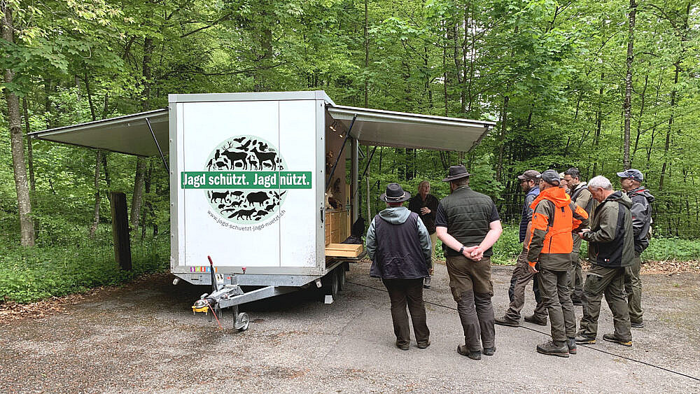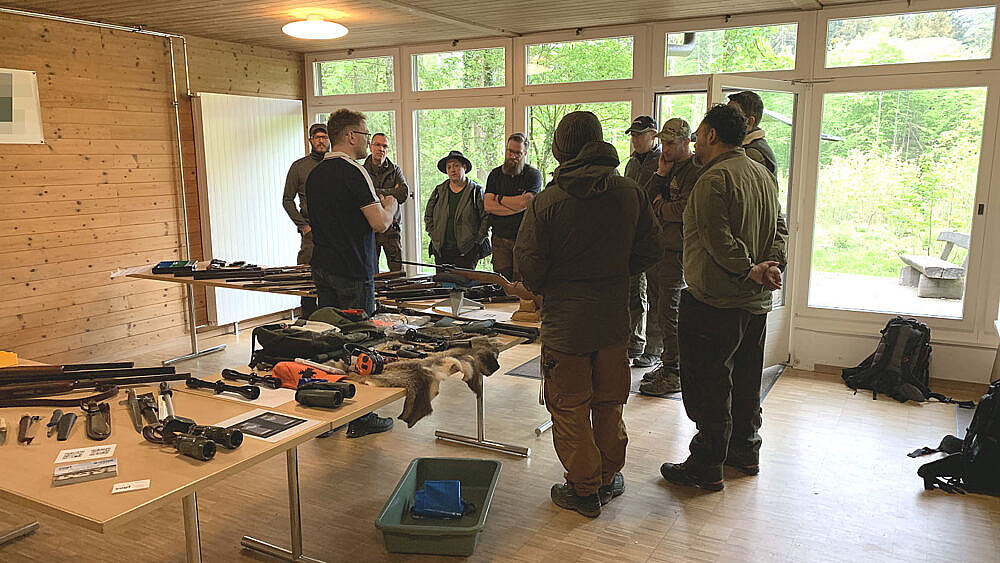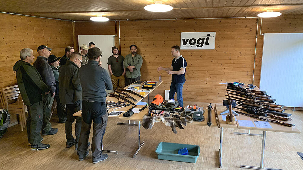 Für den ganztägigen Kurs hatten sich mehr als zwanzig Jagdanwärterinnen und Jagdanwärter angemeldet, um die Gelegenheit wahrzunehmen, viel Wissenswertes über Waffen und Optik, Bäume und Sträucher sowie Jagdhunde zu erfahren. Weiter war der Informations-Anhänger mit zahlreichen Präparaten vor Ort.