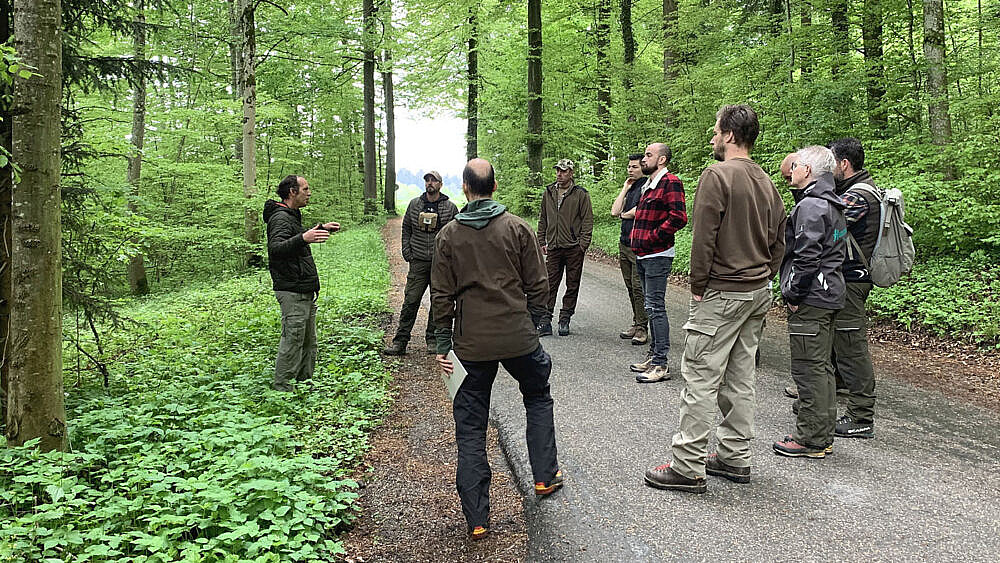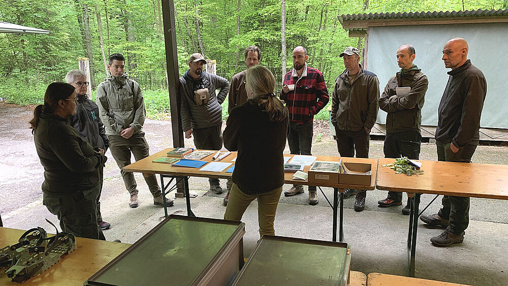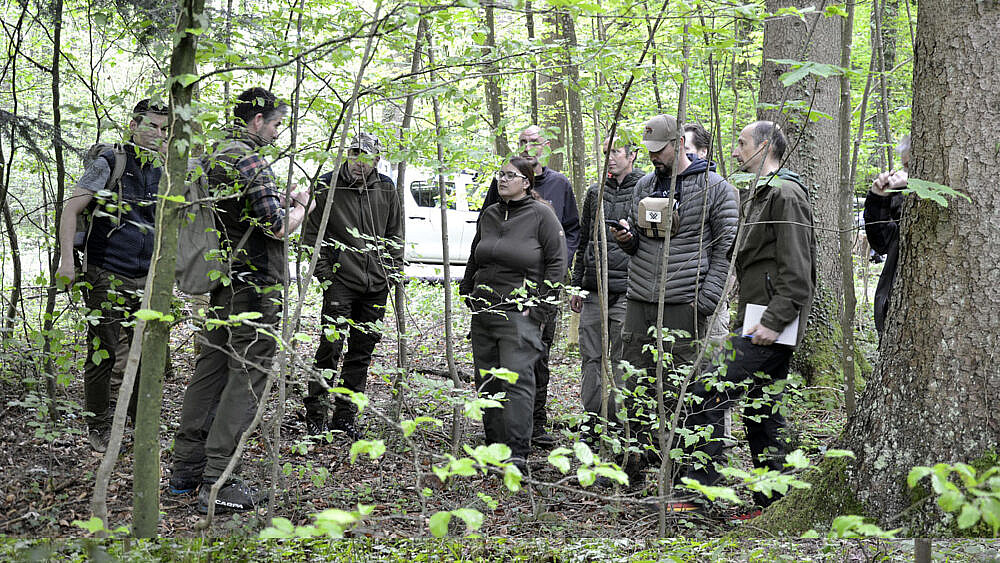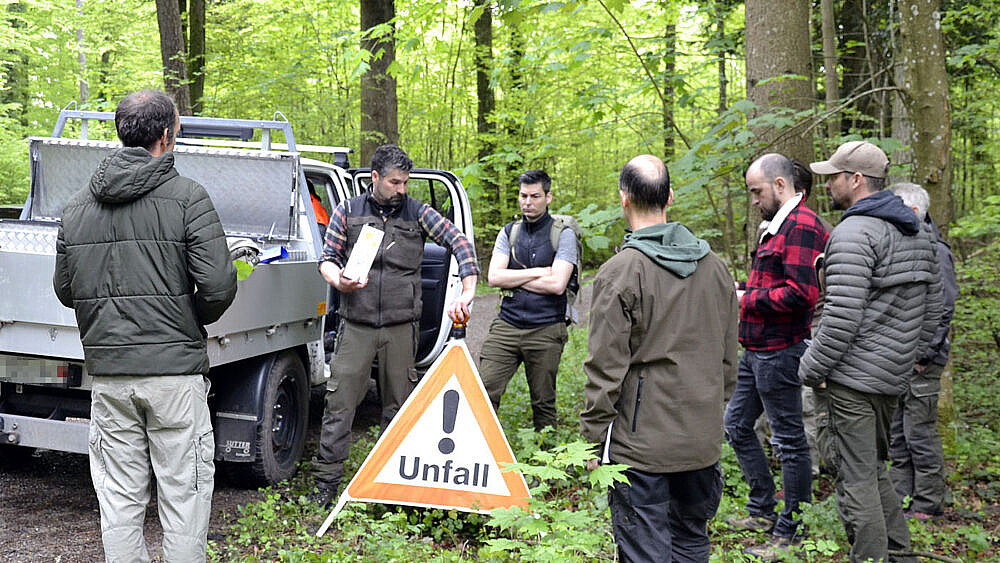 Während des Waldrundgangs trafen die Teilnehmerinnen und Teilnehmer auf einen vorbereiteten Wildunfall, eine jagdliche Situation, die in ihren späteren Pächterleben häufig vorkommen wird. Verhalten und Vorgehen bei Wildunfällen wurden demonstriert und diskutiert.