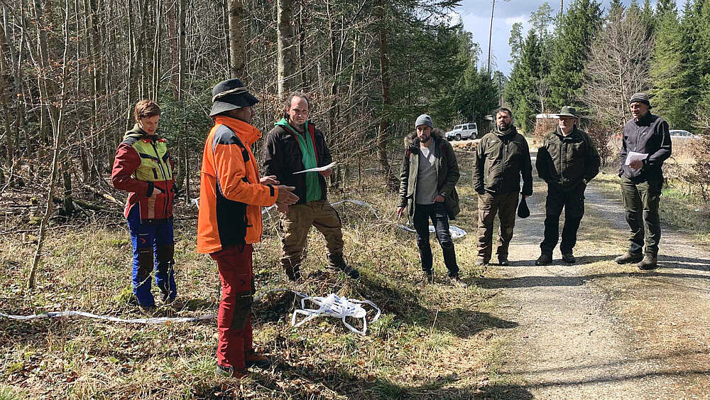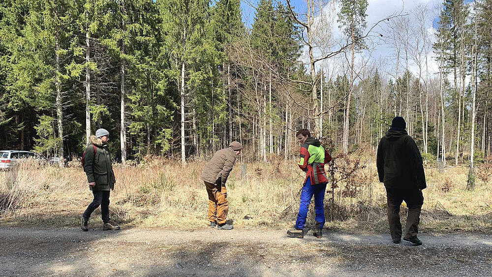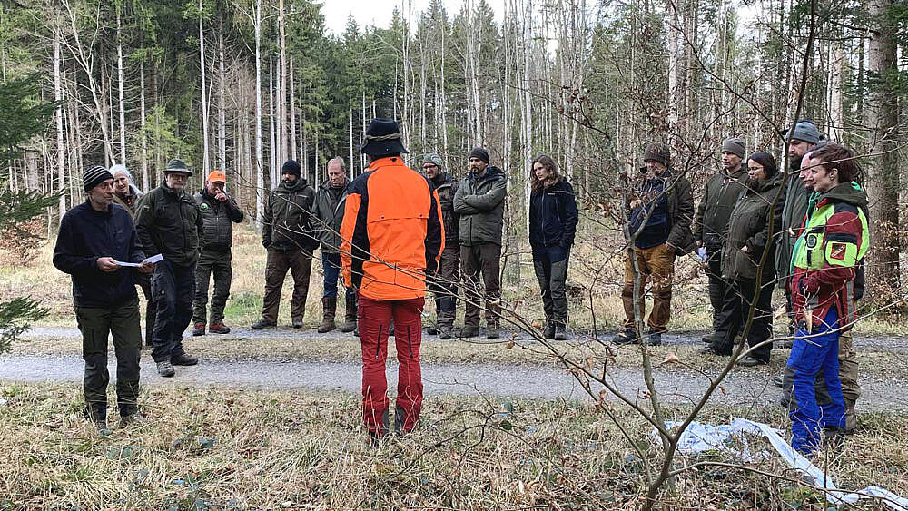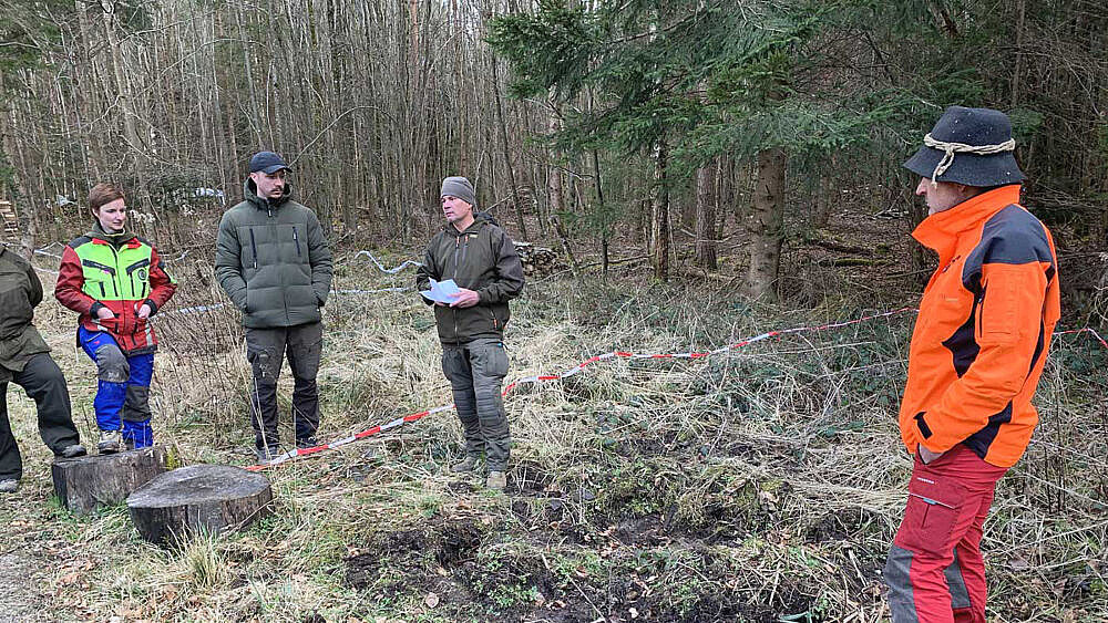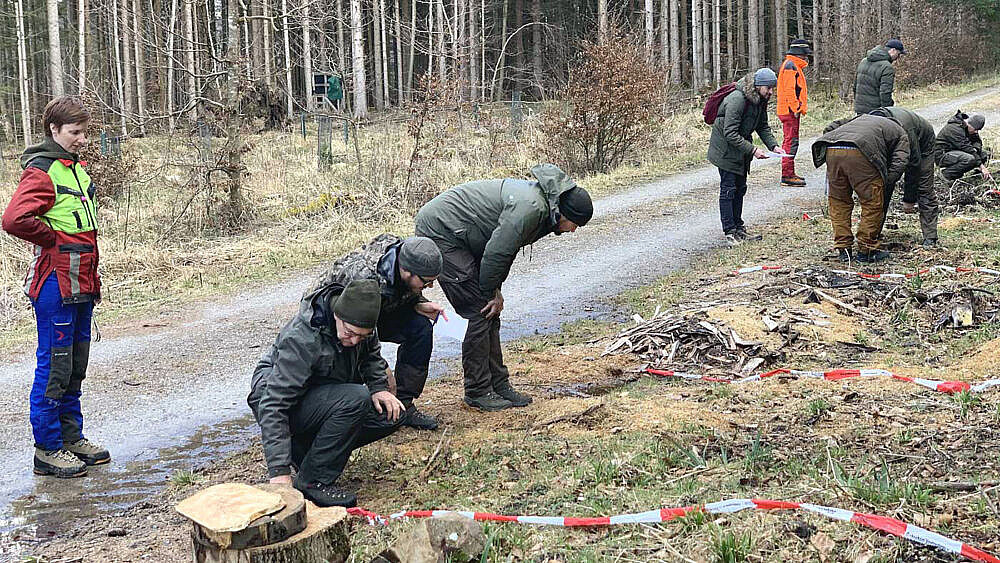 Für den gehaltvollen Praxisteil wurden mit Reh- und Wildschwein-Material sechs Anschüsse präpariert: Kammerschuss, Weidwundschuss, Wildbretschuss, Krellschuss, Laufschuss und Äserschuss. Die Kursteilnehmenden wurden in Gruppen auf die Anschüsse verteilt. Jede Gruppe fasste die Aufgabe, einen der Anschüsse zu interpretieren. Dabei war anhand der entdeckten Pirschzeichen zu klären, wo der Wildtierkörper von der Kugel getroffen wurde. Das jeweils aufgefundene organische Material wurde auf einem Din A4-Blatt gesammelt.