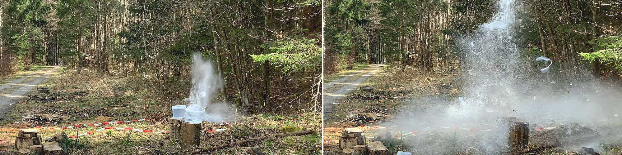 Vergleich der Schusswirkung einer Kurzwaffe (links) mit der einer Langwaffe (rechts). Beschossen wurden wassergefüllte Eimer.
