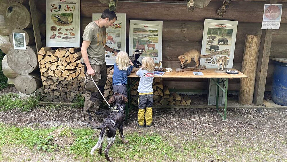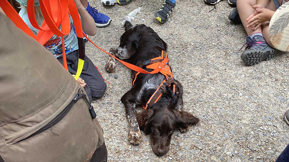 Nach Speis und Trank konnten die Teilnehmerinnen und Teilnehmer Interessantes über Jagdhunde erfahren und zwei Nachsuchen bestaunen. Vor allem die jungen Gäste waren sehr beeindruckt und stellten viele Fragen.